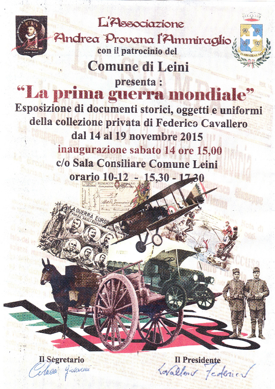 Sabato 14 novembre alle ore 15 si inaugurerà a Leinì (Torino) una mostra sulla prima guerra mondiale. L'esposizione, curata dal presidente di Piemontestoria Federico Cavallero, si terrà presso la Sala Consiliare del Comune di Leinì, in piazza Vittorio Emanuele II n°1.